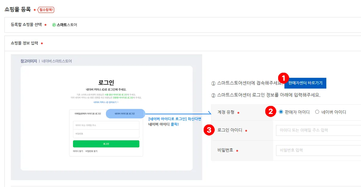 접속할 때 ‘이메일/판매자 아이디로 로그인’한다면 ‘판매자 아이디’를, ‘네이버 아이디로 로그인’한다면 ‘네이버 아이디’를 선택합니다.