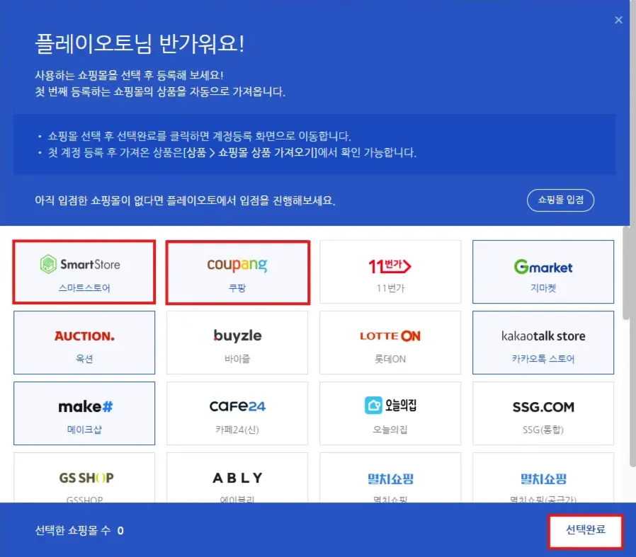 입점한 쇼핑몰을 모두 선택한 후, ‘선택완료’ 버튼을 클릭합니다.
