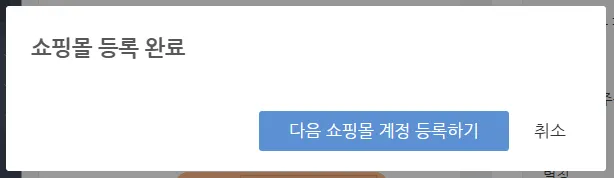 등록 완료 팝업에서 ‘다음 쇼핑몰 계정 등록하기’를 클릭하면 맨 처음 팝업창에서 선택한 다른 쇼핑몰 연동 화면으로 넘어가요.