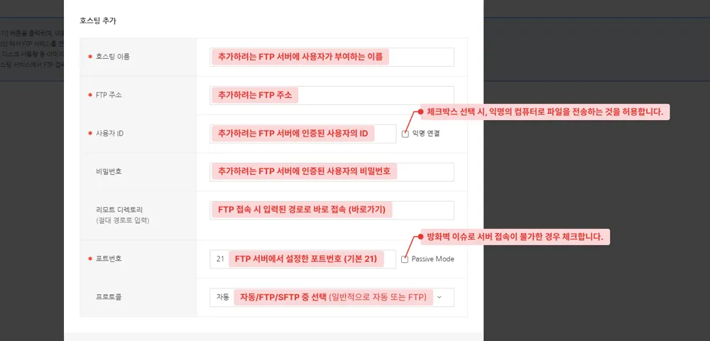 ‘FTP 접속하기’ → ‘+호스팅’ 버튼을 클릭해 필요한 정보를 입력해 주세요.