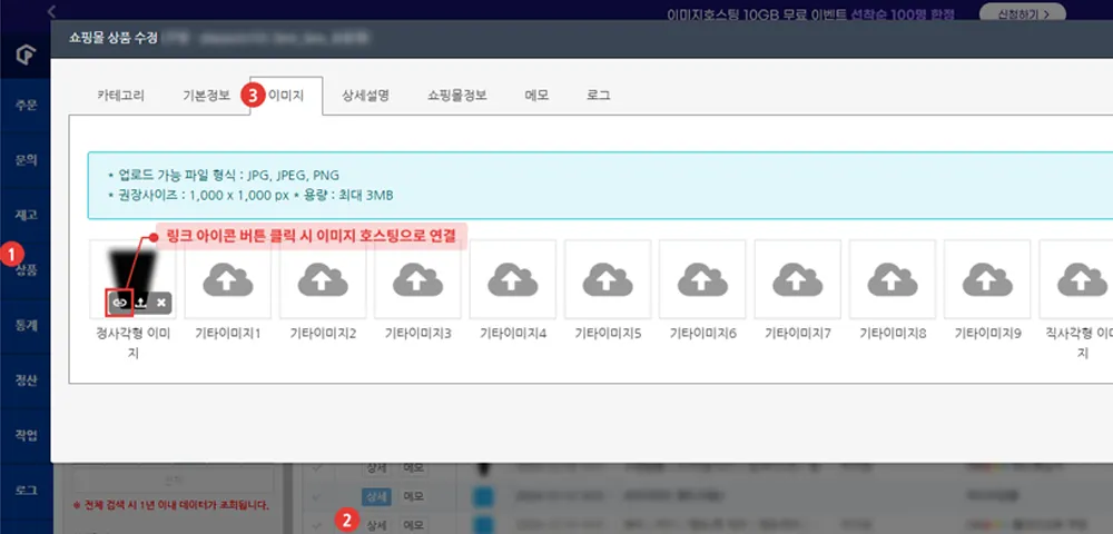 [상품] 메뉴에서 등록한 상품의 ‘상세’ 버튼을 클릭한 후, 이미지/상세설명 탭에서 이미지 아래에 있는 링크 아이콘을 클릭해 주세요.