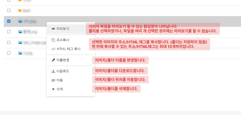 그밖에도 파일을 우클릭하면 미리보기, 주소복사, 태그복사, 이름변경, 다운로드와 같은 여러 가지 작업을 진행하실 수 있어요.