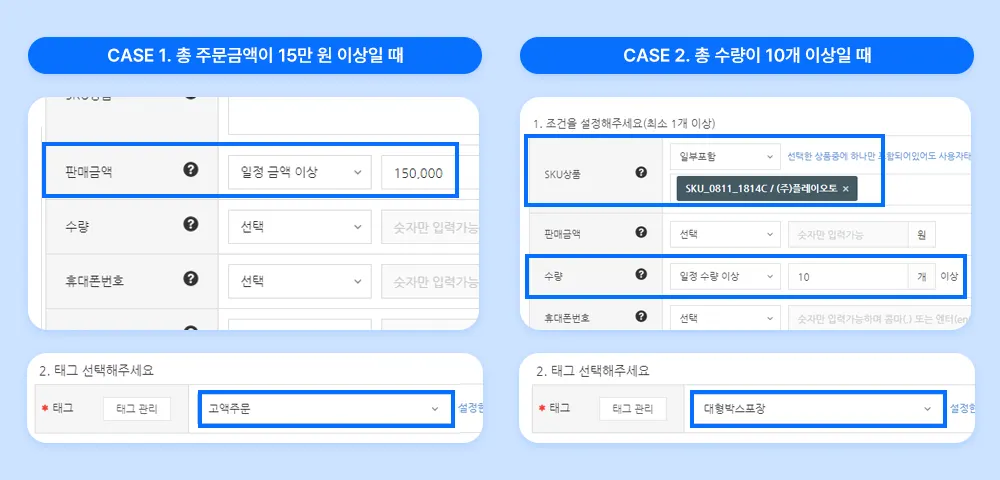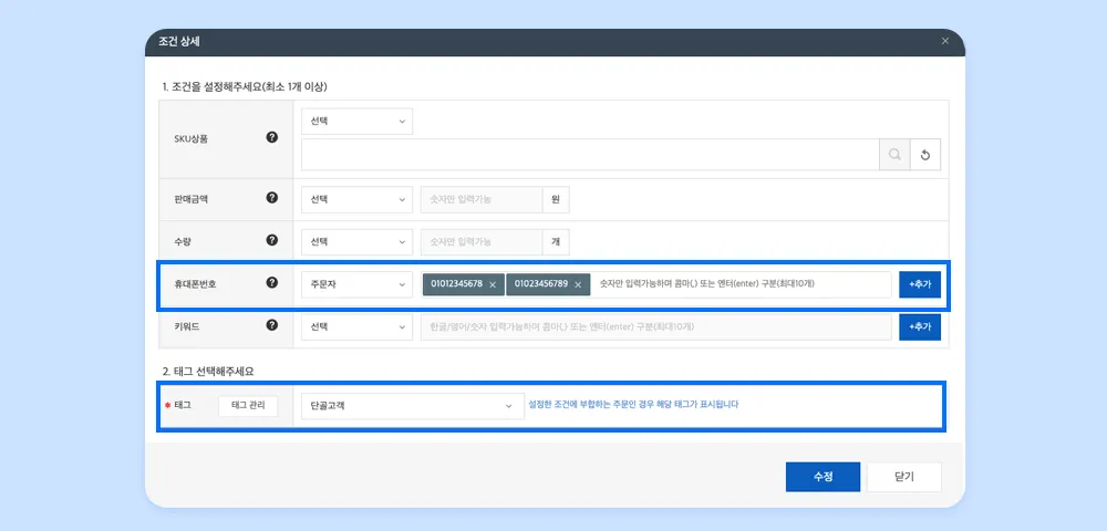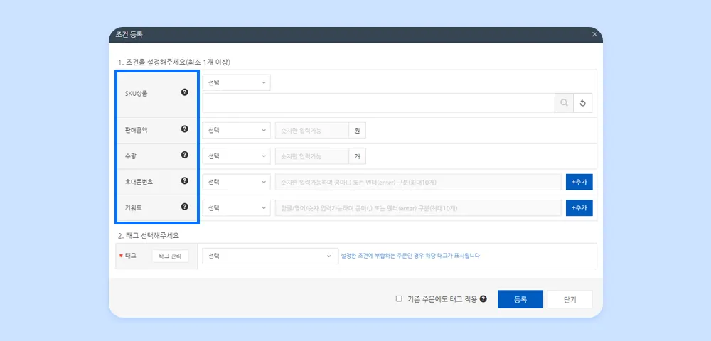 SKU상품, 판매금액, 수량, 휴대폰번호, 키워드 총 5개의 조건을 기준으로 사용자태그를 설정할 수 있어요.