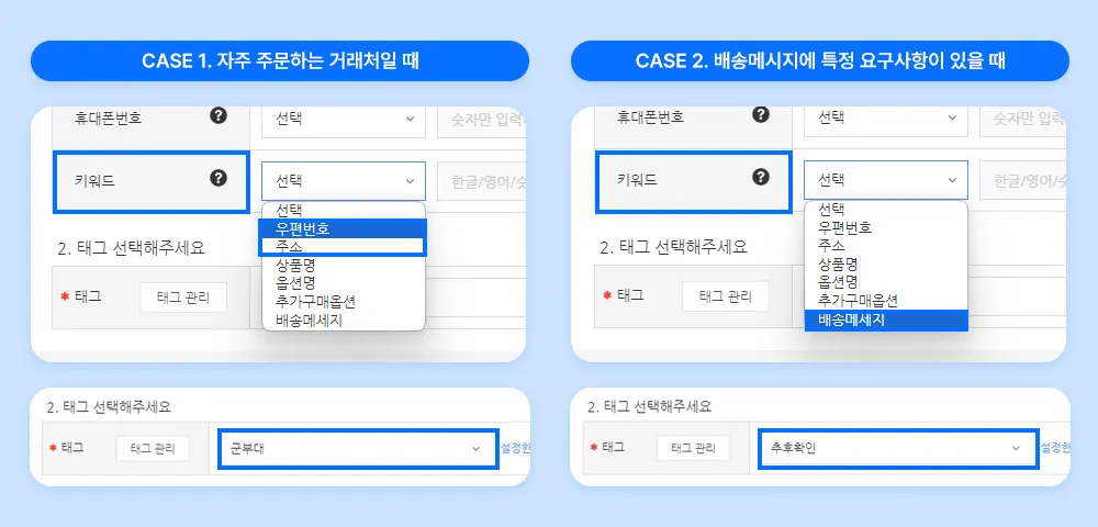 또는 고객이 배송메시지에 요청한 내용 중 특정 단어를 조건으로 설정하여 태그를 적용시킬 수 있어요.