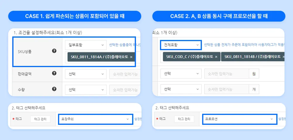 쉽게 파손되는 상품이 포함되어 있는 주문은 모두 ‘포장주의’ 태그가 적용되도록 조건을 설정해 보세요.