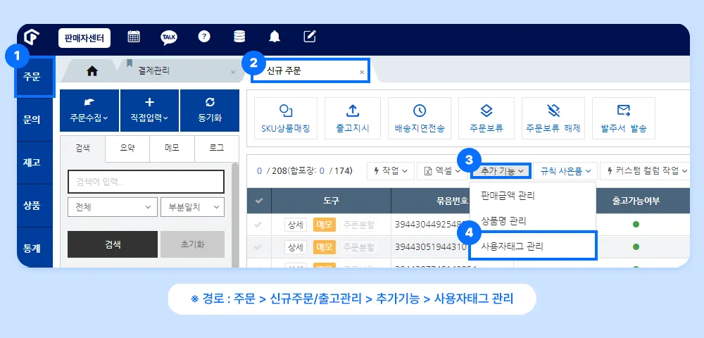 좌측 메뉴 [주문] → [신규주문] 또는 [출고관리] 에서 ‘추가 기능’ → ‘사용자태그 관리’를 클릭해 주세요.