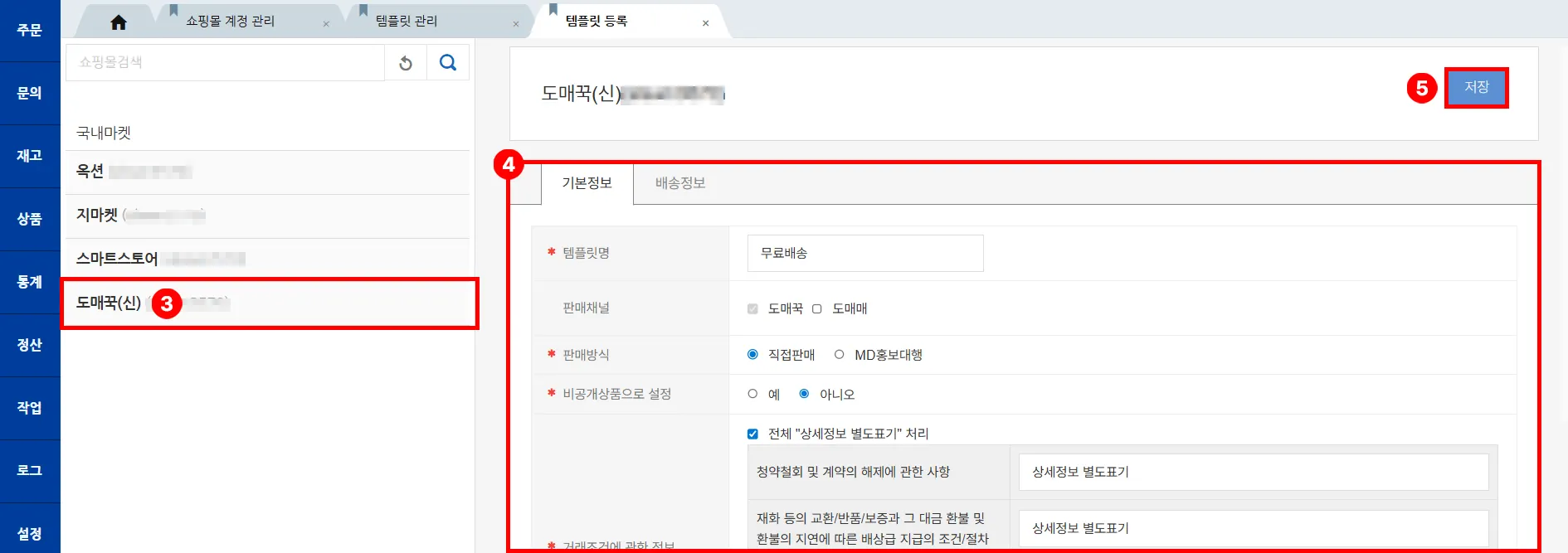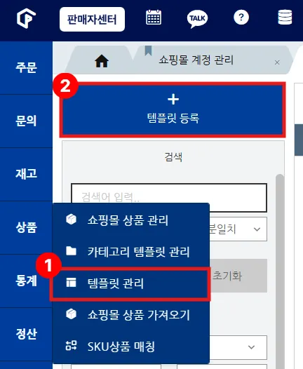 좌측 상단 ‘템플릿 등록’ 버튼을 클릭하면 연동한 쇼핑몰 리스트를 확인하실 수 있습니다.