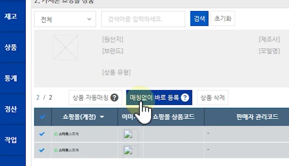 작업이 끝났다면 솔루션에 가져올 상품들을 모두 체크한 뒤, ‘매칭없이 바로 등록’ 버튼을 클릭합니다.