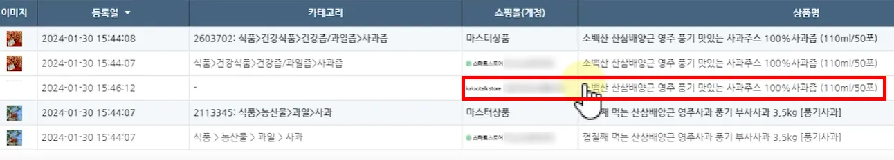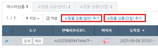 [쇼핑몰 상품 관리] 화면으로 돌아오면 선택한 쇼핑몰에 상품의 기본정보를 가져와 추가한 것을 확인하실 수 있습니다.