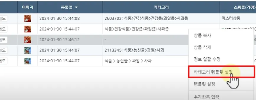 가져온 상품을 우클릭한 뒤, ‘카테고리 템플릿 설정’을 클릭합니다.