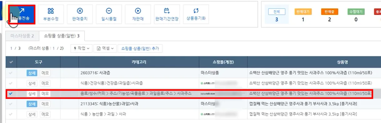 다른 쇼핑몰로 전송하길 원하는 상품들을 모두 선택해 ‘쇼핑몰 상품(일반) 추가’ 버튼을 클릭해 주세요.