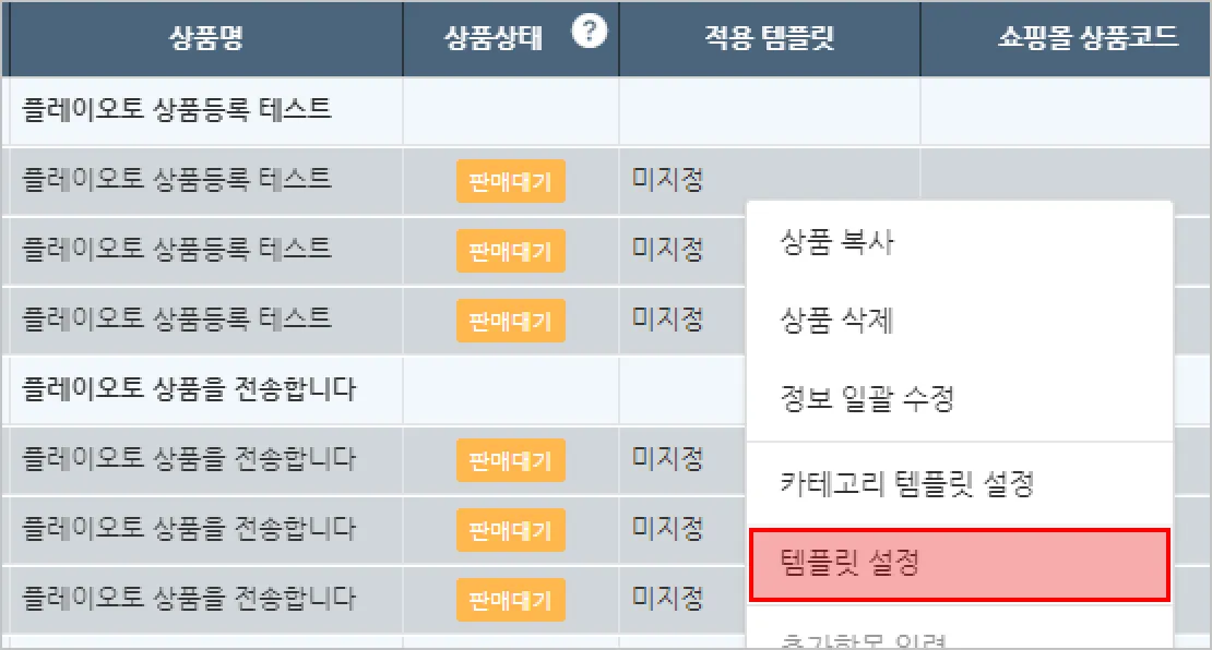 좌측 메뉴 [상품] → [쇼핑몰 상품 관리]로 다시 돌아와, 템플릿을 적용하고 싶은 상품을 우클릭한 뒤 ‘템플릿 설정’을 클릭합니다.