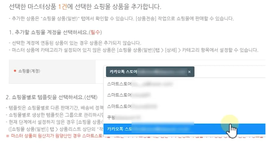 1. 추가할 쇼핑몰 계정을 선택하세요.에서 퀵 등록으로 상품을 전송하지 못한 쇼핑몰을 모두 선택해 주세요.