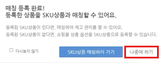 등록이 완료되면 아래와 같은 팝업이 노출됩니다. ‘나중에 하기’ 버튼을 클릭합니다.