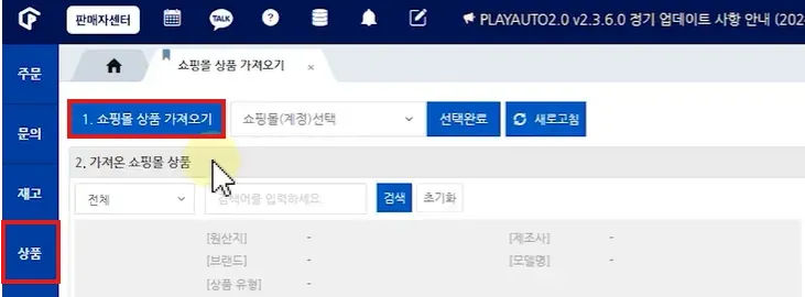 좌측 메뉴 [상품] → [쇼핑몰 상품 가져오기]로 이동한 뒤, ‘1.쇼핑몰 상품 가져오기’ 버튼을 클릭합니다.