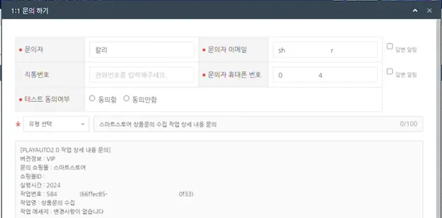 ‘테스트 동의여부’는 플레이오토 운영팀이 담당자님 계정으로 작업 실패 원인을 직접 테스트해봐도 괜찮은지 확인하는 항목입니다.