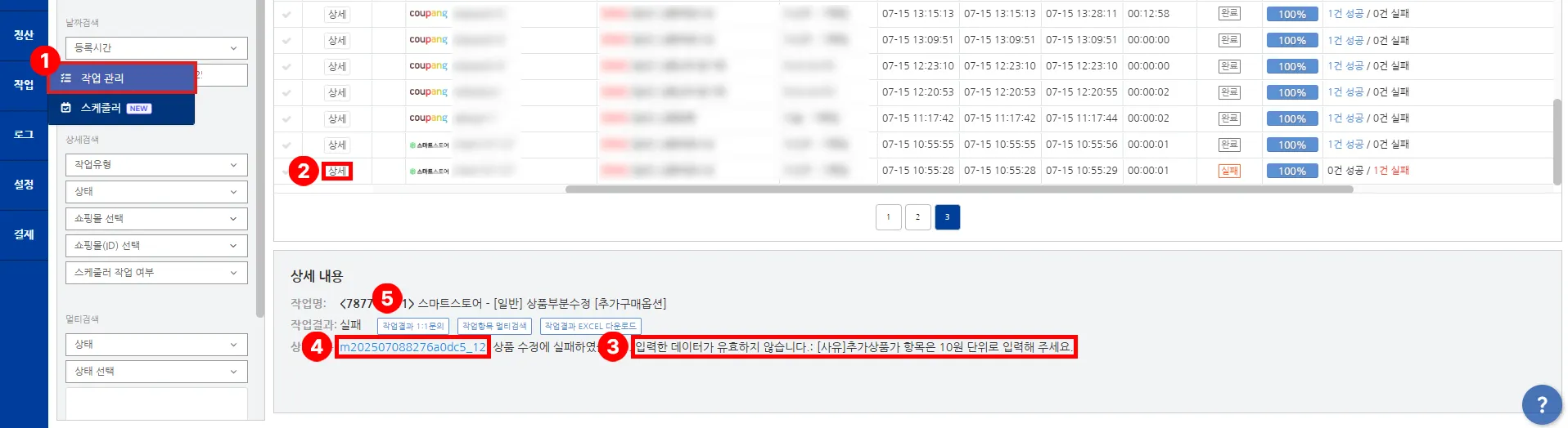 실패한 작업이 있을 경우 ‘상세’ 버튼을 클릭합니다.