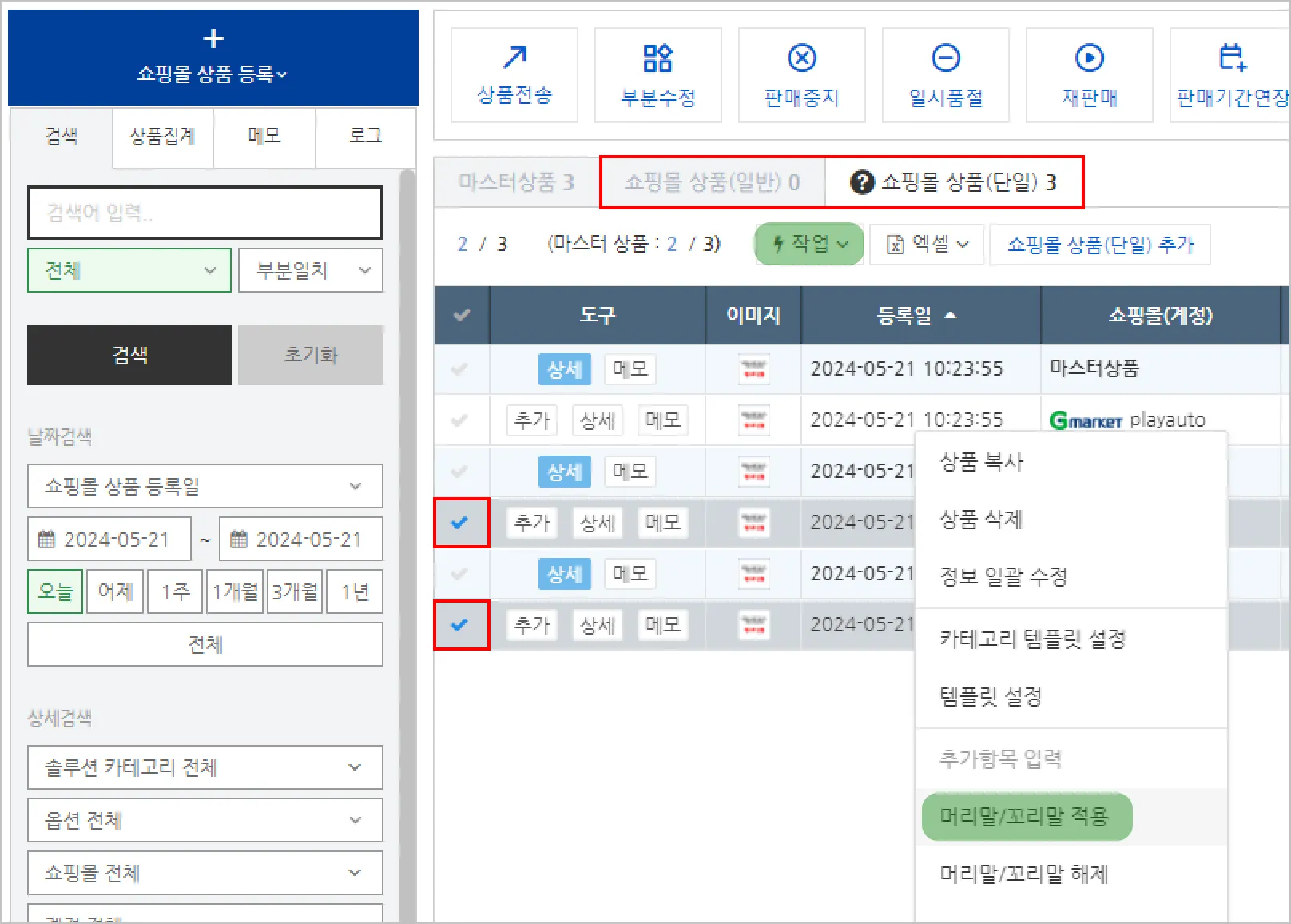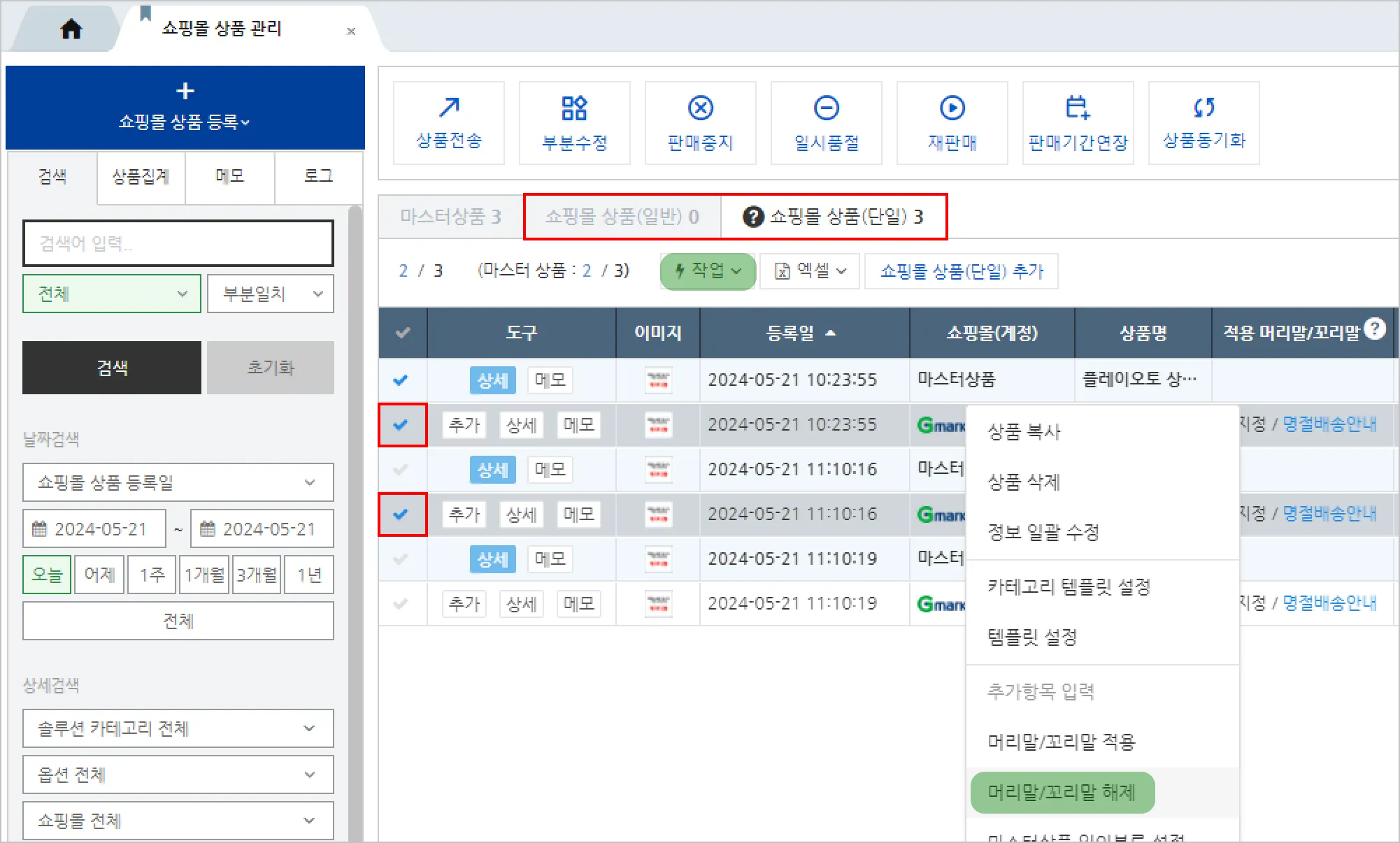 좌측 메뉴 [상품] → [쇼핑몰 상품 관리] 화면에서 머리말/꼬리말을 해제하려는 상품을 선택한 후, 우클릭 또는 ‘작업’ 버튼을 클릭합니다.