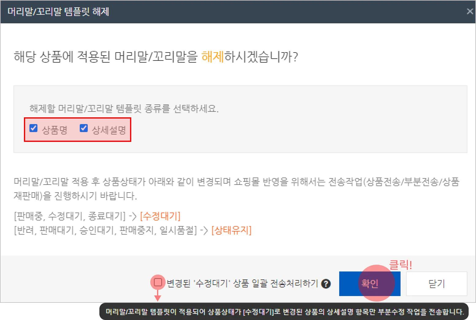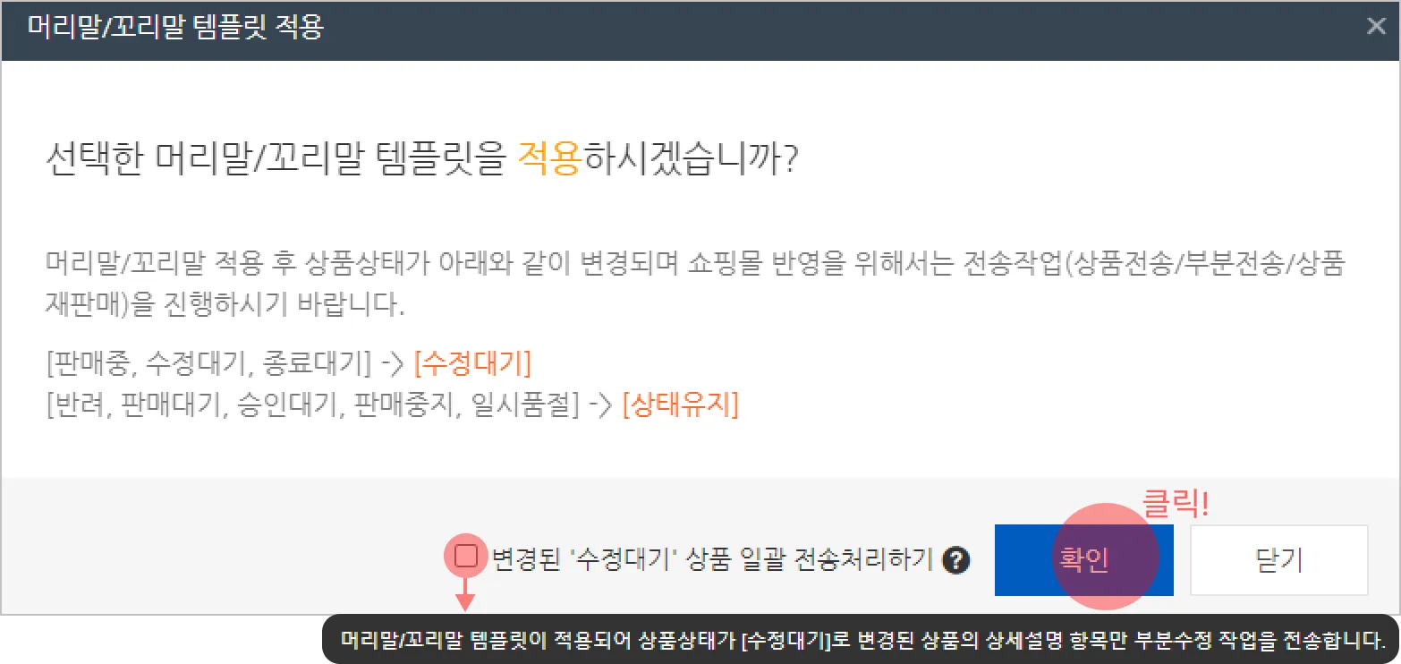 만약 ‘변경된 ‘수정대기’ 상품 일괄 전송처리하기’에 체크한다면 자동으로 [부분수정] 작업이 진행됩니다.