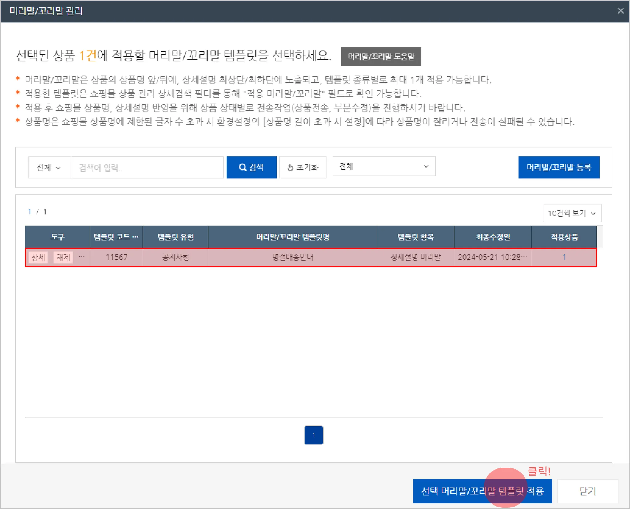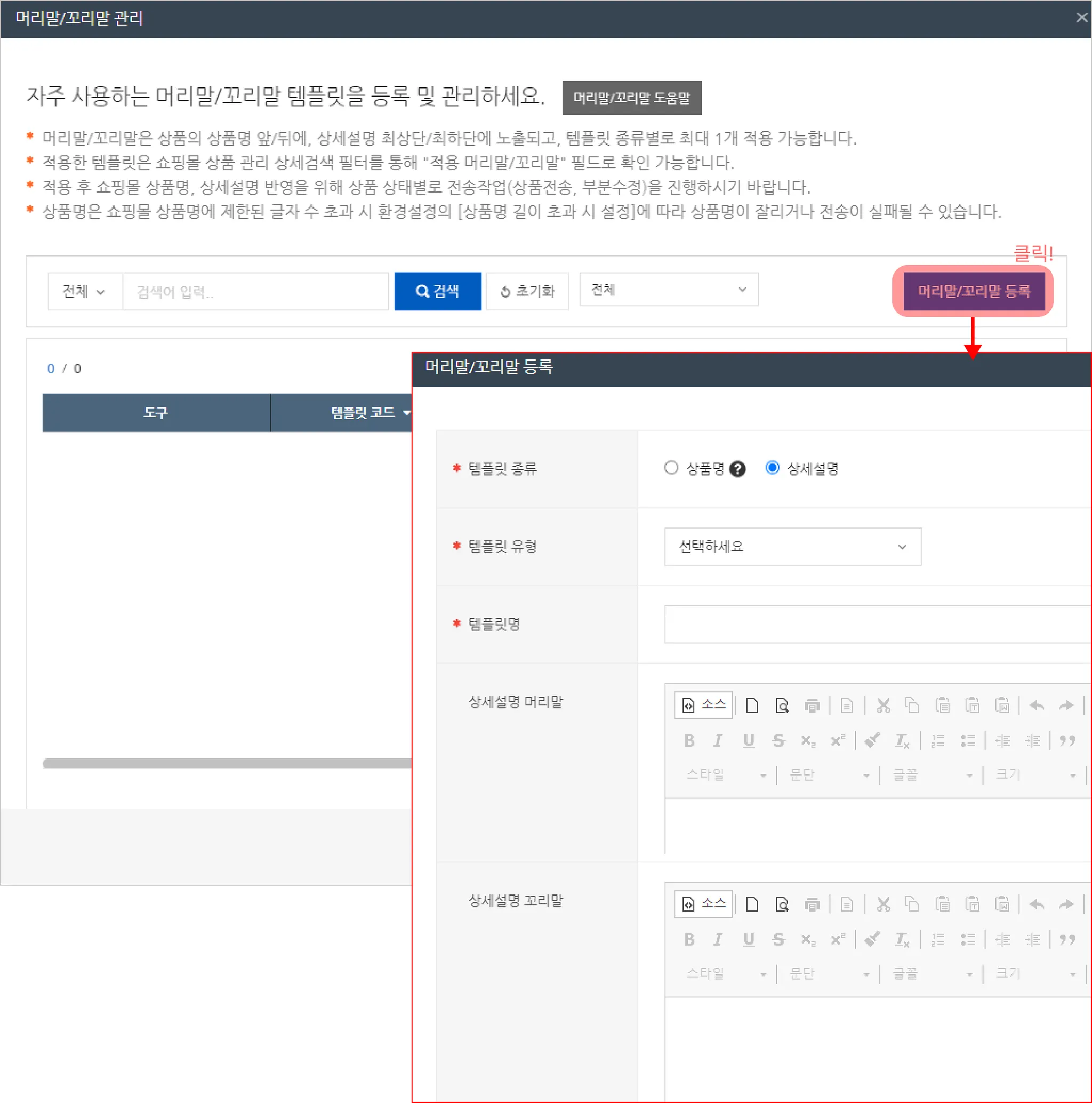예를 들어 쇼핑몰상품의 상세설명 내 공지사항을 원하시는 경우에는 템플릿 종류를 ‘상세설명’으로 선택해 주셔야 해요.