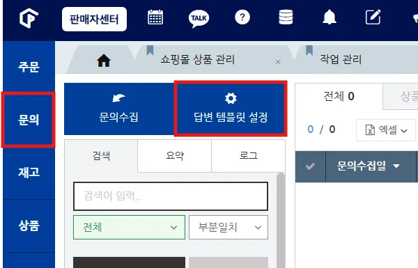 좌측 메뉴 [문의]로 이동한 후, ‘답변 템플릿 설정’ 버튼을 클릭해 주세요.