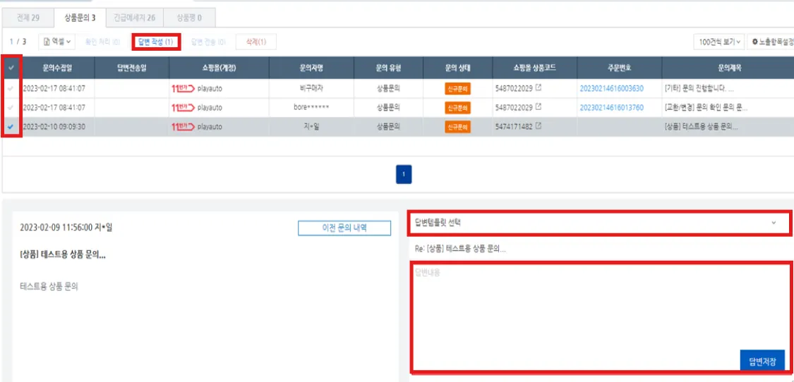 수집된 문의는 건별로 선택한 후 하단 또는 ‘답변 작성’ 버튼을 클릭해 답변을 저장할 수 있어요.