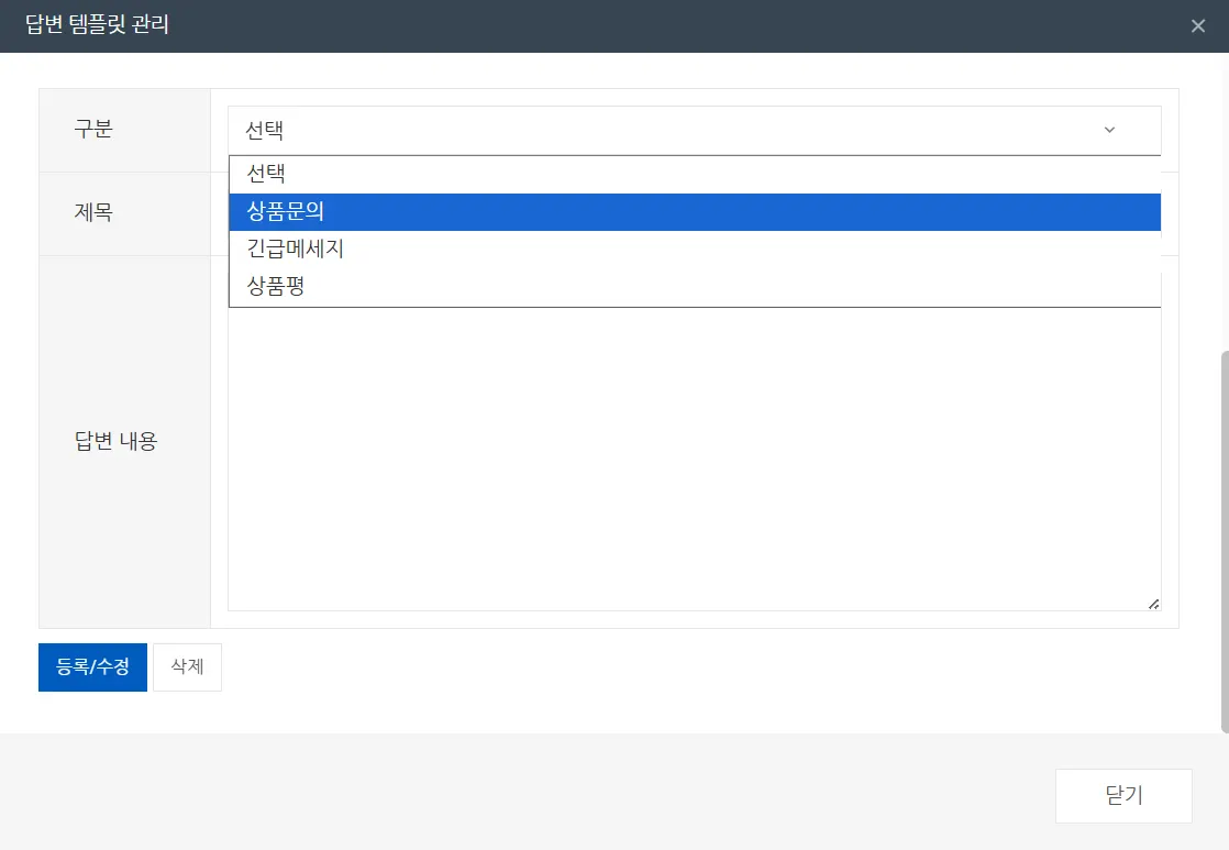 템플릿을 구분할 제목과 답변 내용을 입력한 후, ‘등록/수정’ 버튼을 클릭하세요.