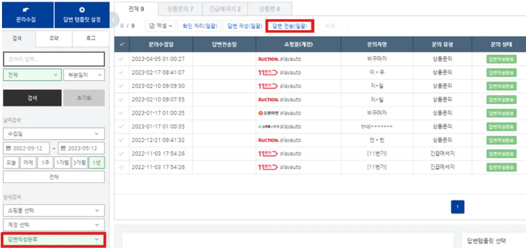 답변은 바로 전송되지 않고, 상단의 ‘답변 전송(일괄)’ 버튼을 클릭해야 전송돼요.