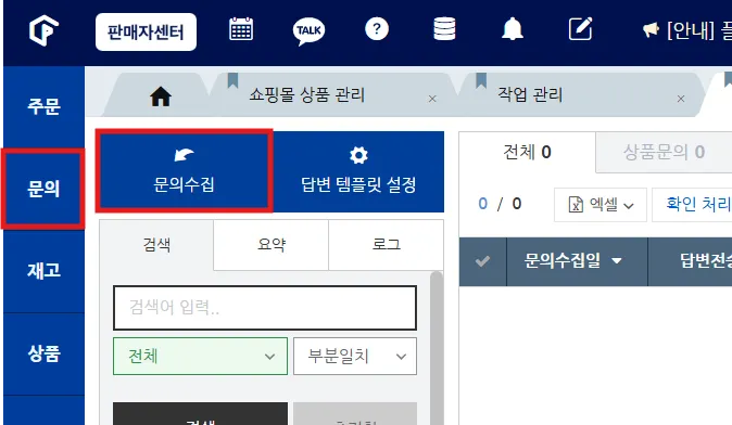 ‘문의 수집’ 버튼을 클릭하면 쇼핑몰에서 답변 처리가 되지 않은 신규 문의를 수집할 수 있어요.