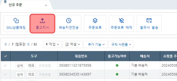 좌측 메뉴 [주문] → [신규주문]에서 원하는 주문을 선택해 [출고지시] 작업을 진행해 주세요.