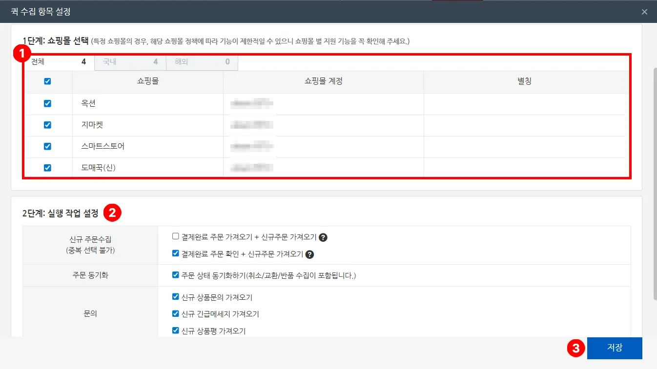 항목 설정 창에서 쇼핑몰을 선택할 수 있으며, 이후에는 ‘퀵 수집’ 버튼 옆 톱니바퀴 아이콘을 클릭해 설정을 수정할 수 있어요.