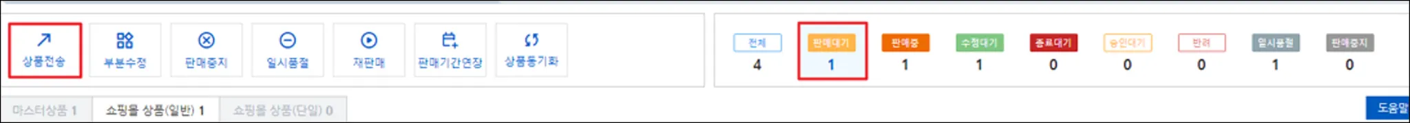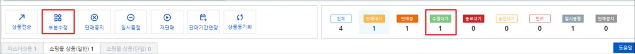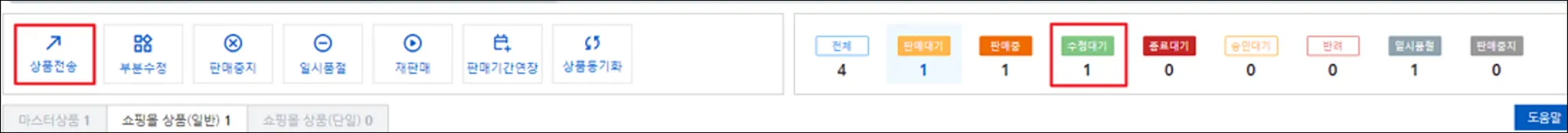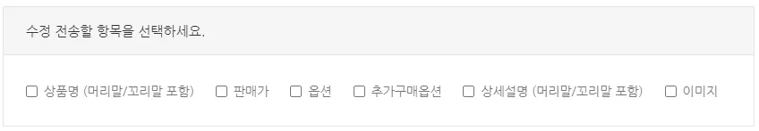 ▲ 부분수정이 가능한 항목들이에요. 그 외 항목은 [상품전송] 버튼으로 전송해요.