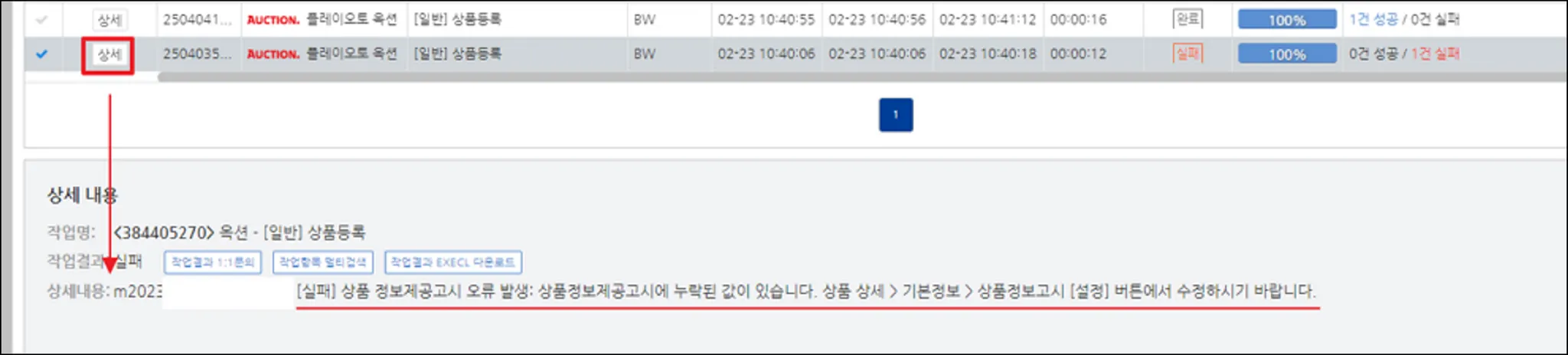 실패 사유를 확인하고 상품정보를 수정해서 다시 [상품전송] / [부분수정] 버튼을 클릭해요.