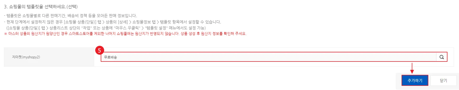 Step 5. 선택한 쇼핑몰의 템플릿을 선택하고 [추가하기] 버튼을 클릭해요.