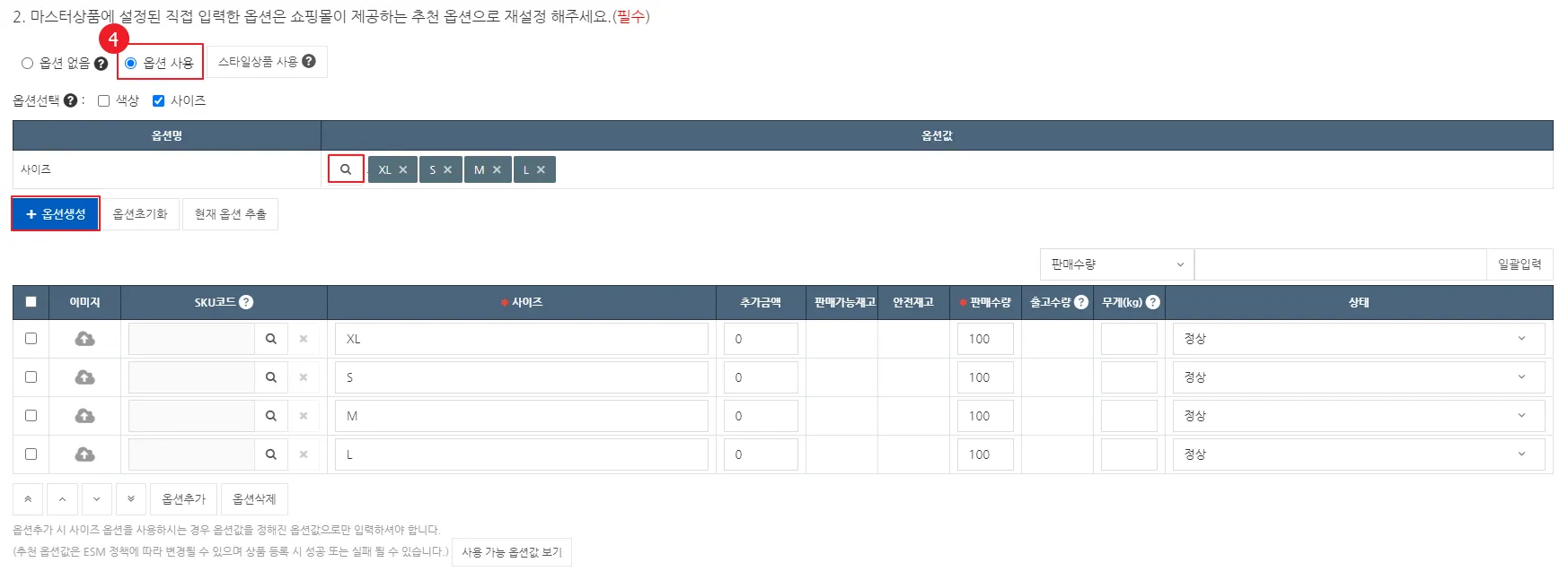 ① 선택된 카테고리에 따라 쇼핑몰이 추천하는 옵션명 등을 확인하고 설정할 수 있어요.
