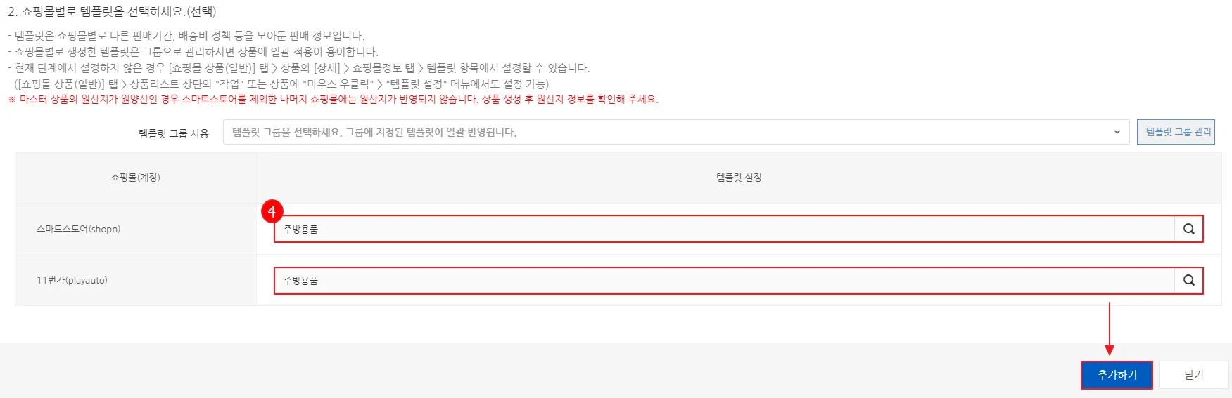 Step 4. 선택한 쇼핑몰의 템플릿을 선택하고 [추가하기] 버튼을 클릭해요.