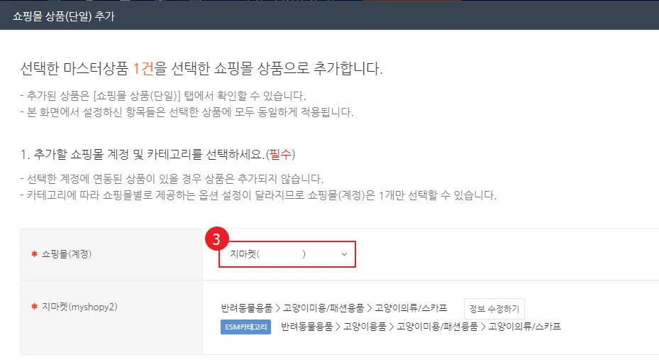 ① 단일상품의 특성상 쇼핑몰(계정)은 1개만 선택할 수 있어요.