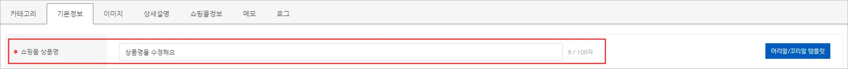 경로: 수정하고자 하는 쇼핑몰 상품의 [상세] > 기본정보 탭 > “쇼핑몰 상품명” 항목 수정 > 화면 우측 하단의 [수정] 버튼을 눌러 적용