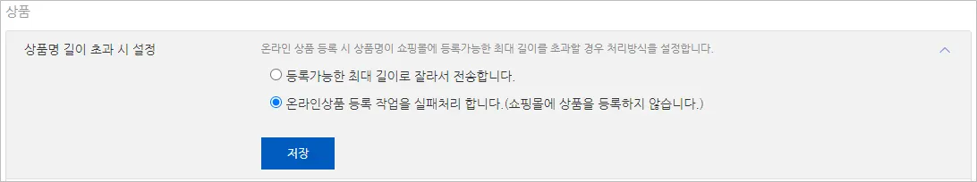 설정 > 환경설정 > 상품 > “상품명 길이 초과 시 설정” 항목 > “등록가능한 최대 길이로 잘라서 전송합니다.” 체크 후 [저장]