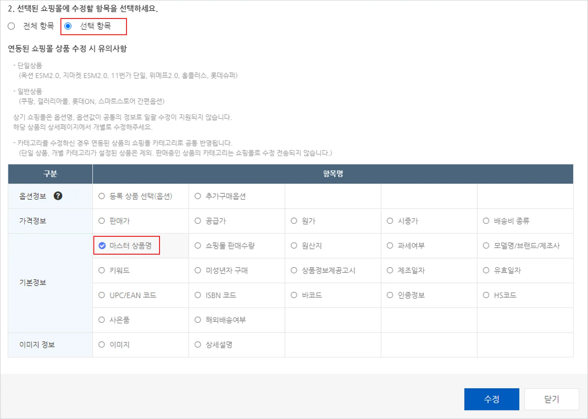 ⑤ 쇼핑몰에 반영할 항목을 선택하고 화면 우측 하단의 [수정]버튼을 눌러 적용해요.