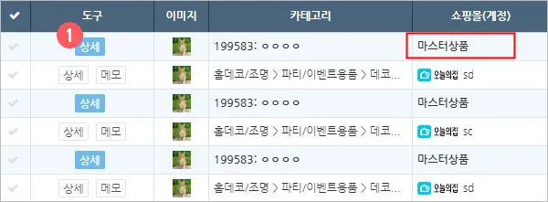 ① 수정하려는 쇼핑몰 상품의 [상세]버튼을 눌러