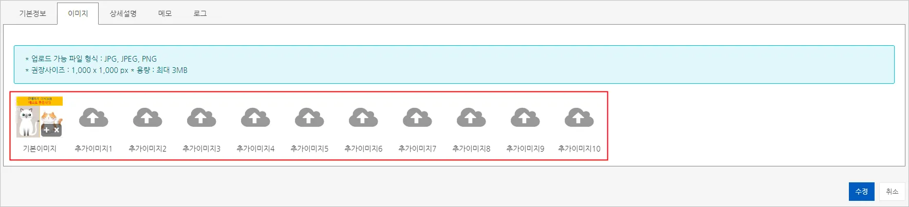 경로: 수정하고자 하는 마스터상품의 [상세] > 이미지 탭 > 기본이미지, 추가이미지1~추가이미지10