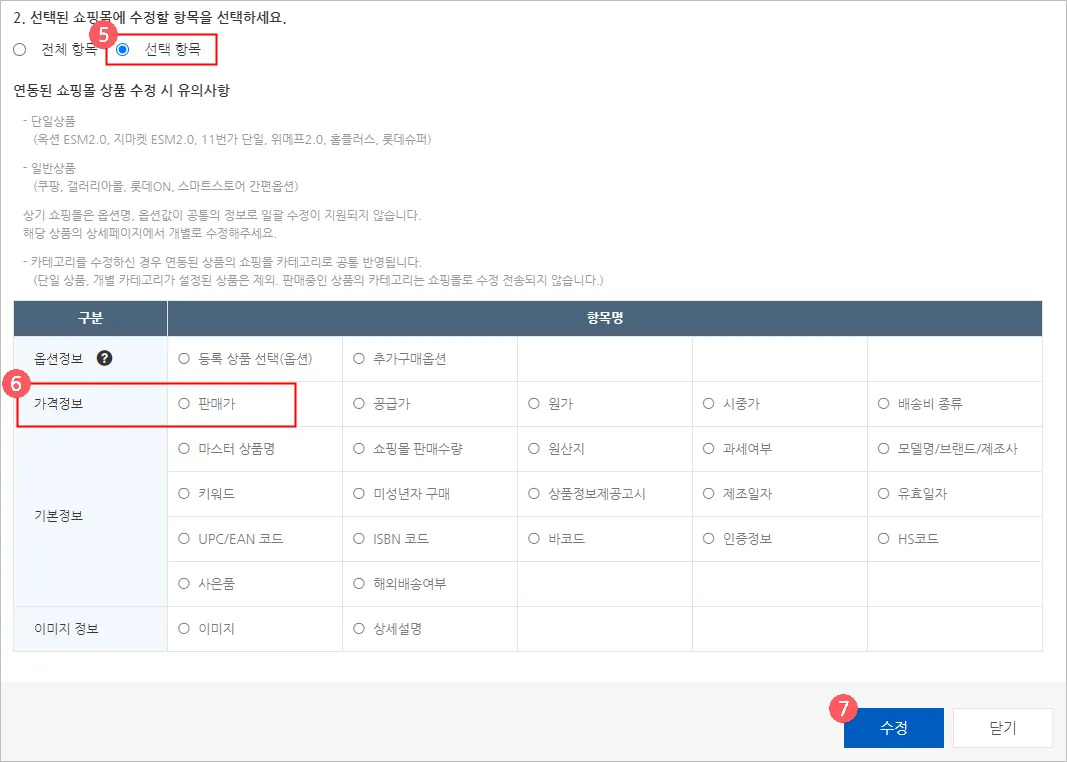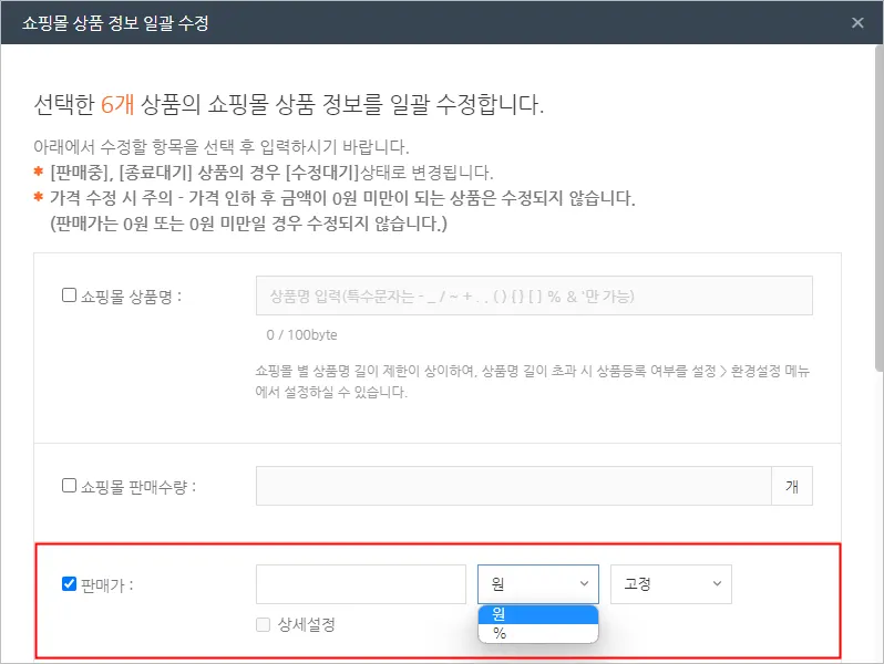 “선택 항목”에 체크 후 “판매가” 항목에 체크 > 화면 하단의 [수정] 버튼을 눌러 적용