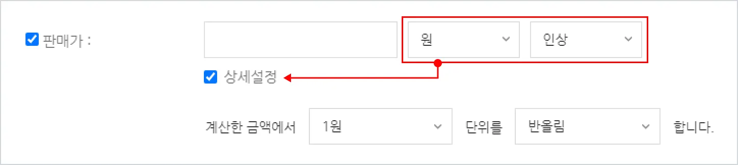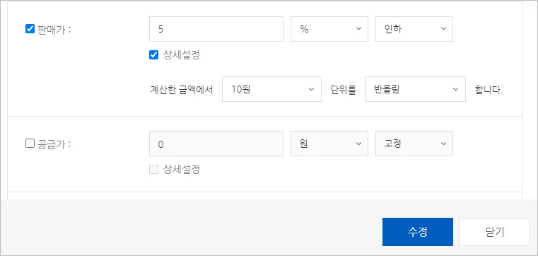 금액 단위인지, 인상율 또는 인하율을 설정하면 “상세설정”을 선택할 수 있고, 올림, 반올림 등의 조건을 설정할 수 있어요.