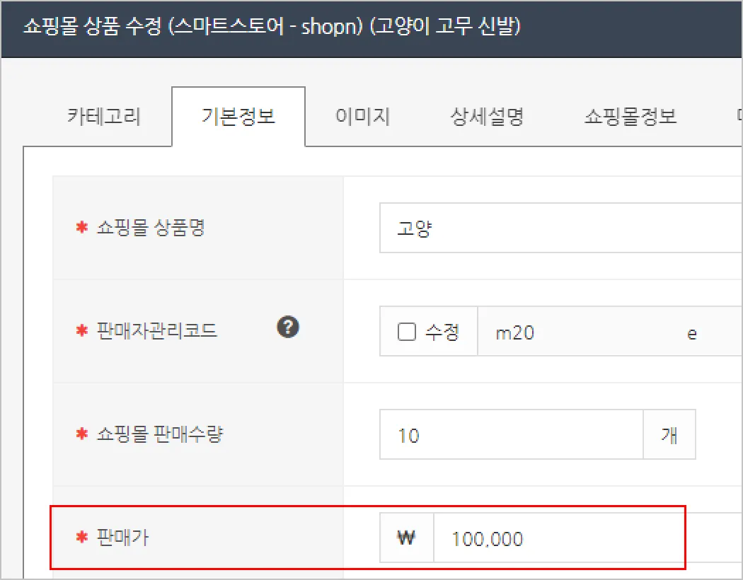 ② 기본정보 탭의 “판매가”항목을 수정해요.